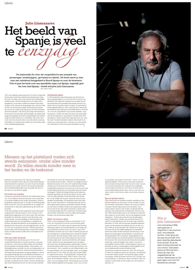 mooi en secuur vertaald door Keimpe Reitsma. In ruim 200 makkelijk leesbare pagina’s reist de hoofdpersoon te voet langs de oevers van de rivier de Curueño , in een dunbevolkt, bergachtig gebied in het noorden van de regio Castilla y León, grenzend aan Asturias. De reiziger (duidelijk de schrijver zelf) komt oorspronkelijk uit deze streek, die hij dit keer bezoekt als nieuwsgierige buitenstaander. Er is zelfs een dorp dat Llamazares heet. Kleine gebeurtenissen – en soms een groot dorpsgeheim – komen op zijn pad tijdens zijn voetreis tegen de stroom van de rivier in. Op treffende wijze schetst de auteur het eenvoudige, vaak eenzame en harde bestaan op het Spaanse platteland, waar de ontvolking reeds in 1981