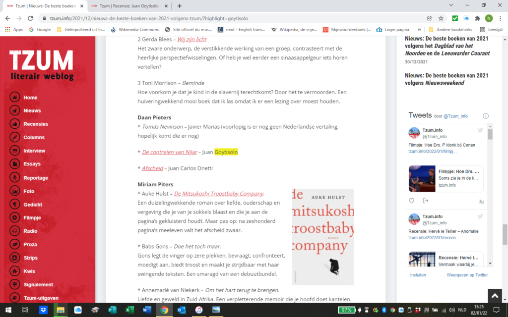 TZUM, Literair weblog, 16 april 2021, recensie door Daan Pieters: https://www.tzum.info/2021/04/recensie-juan-goytisolo-de-contreien-van-nijar/