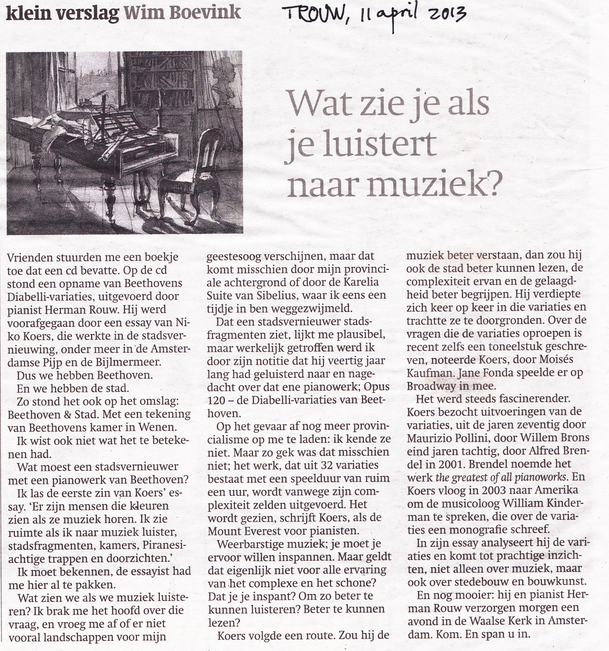 “Geweldig om na veertig jaar nog steeds een verhouding (met een stuk muziek) te hebben en nieuwe dingen te kunnen blijven horen.” “U hoorde Diabelli variatie nummer 31 van Beethoven door Herman Rouw. Ja, dan zie ik mezelf echt dromend langs de Amstel wandelen en zie ik in de verte de stad liggen.” Diewertje Blok, NTR Podium 12 april 2013